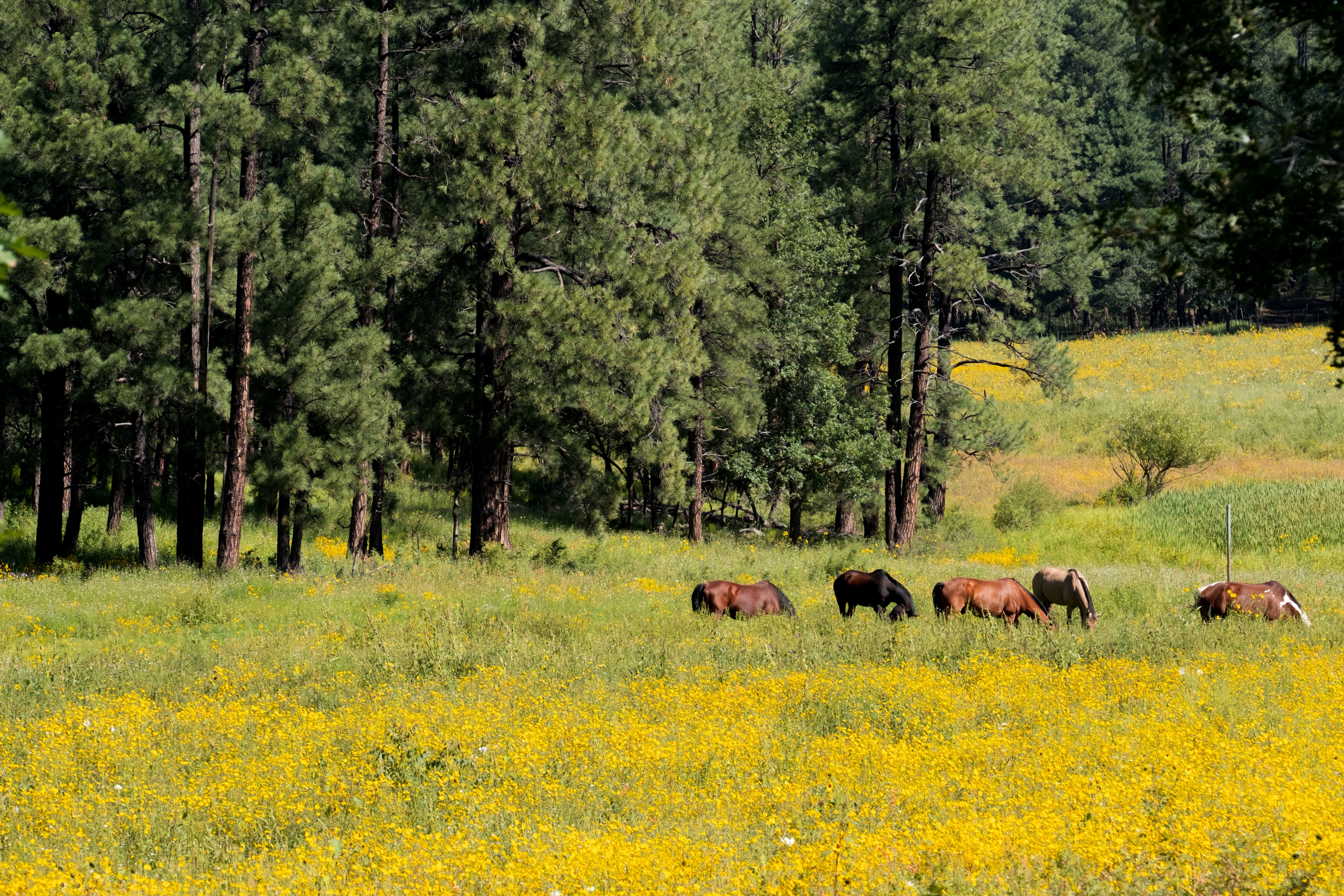 I had family staying 30 or so miles away from the campground, I would pick them up in the morning and drive them back in the evening. The road that connected us was a winding road through the forest, along the way there were meadows strewn with sunflowers and wild horses. On these drives, with the windows down, I noticed I could hear the ceremonial songs in the breeze. Then when I sat by the sweat lodges down by the river, I could hear the singers in the voice of the river… I could almost see the singers with their drums as if they were wading through the winds and water.